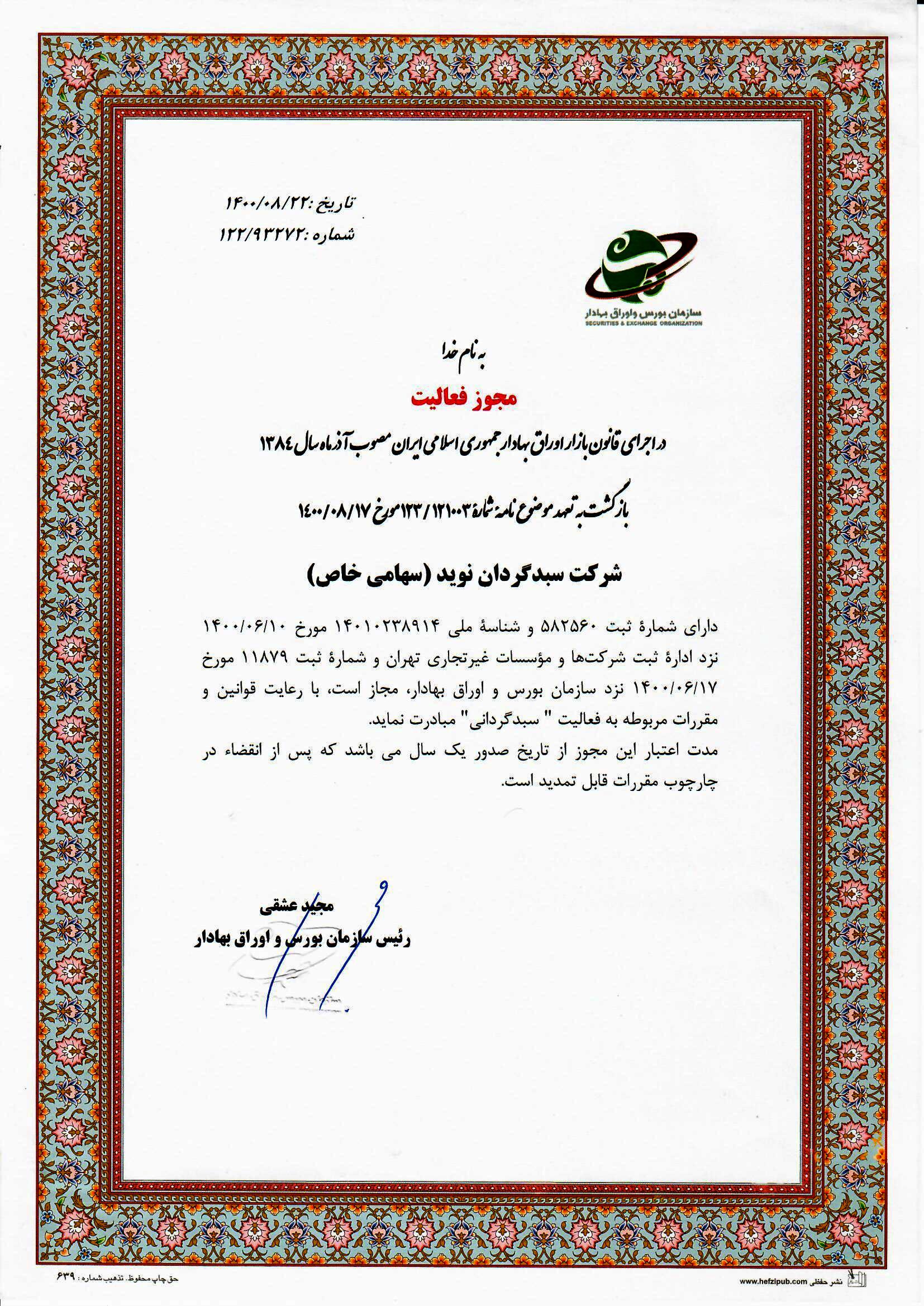 برای ارائه خدمات سبدگردانی، شرکت باید یک نهاد مالی باشد و نزد سازمان بورس و اوراق بهادار ثبت شده باشد و همچنین مجوز سبدگردانی از سازمان بورس و اوراق بهادار داشته باشد. شرکت سبدگردان نوید در تاریخ 17/06/1400 به شماره ثبت 11879 نزد سازمان بورس ثبت شده است و مجوز فعالیت خود را در حوزه سبدگردانی دریافت کرده است.